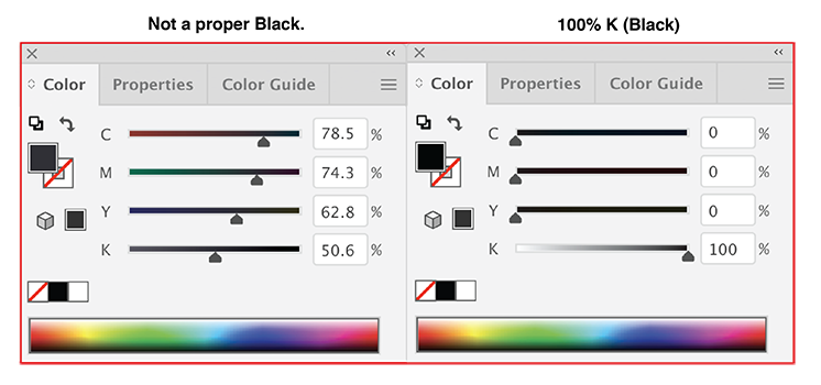 To get a deep "rich black" set all four colour values (C,M,Y, K) to 100% each. Setting to K only to 100% or a % value of anything less than 100 will result in a washed-out black.
