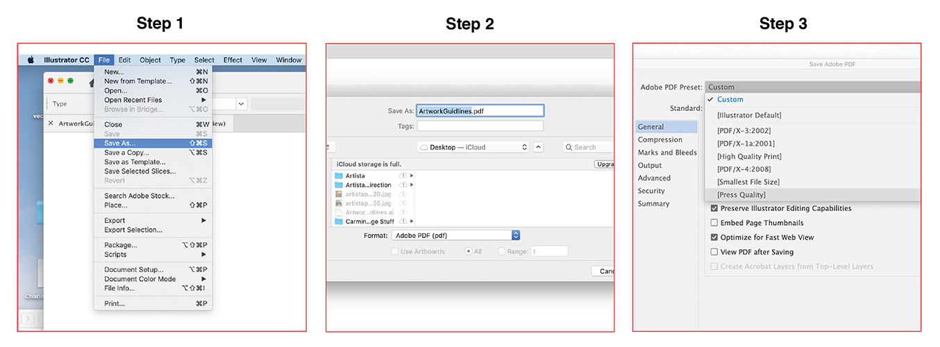PDF (Portable Document Format) is a universal file format designed to present documents consistently across multiple devices and platforms. Make sure to select a high resolution option when saving this file type if option is available. This saving option is generally done using the “Save As” command in programs such as Adobe Illustrator, Adobe Photoshop, Microsoft Word, or sometimes as “ Export” in Adobe InDesign.